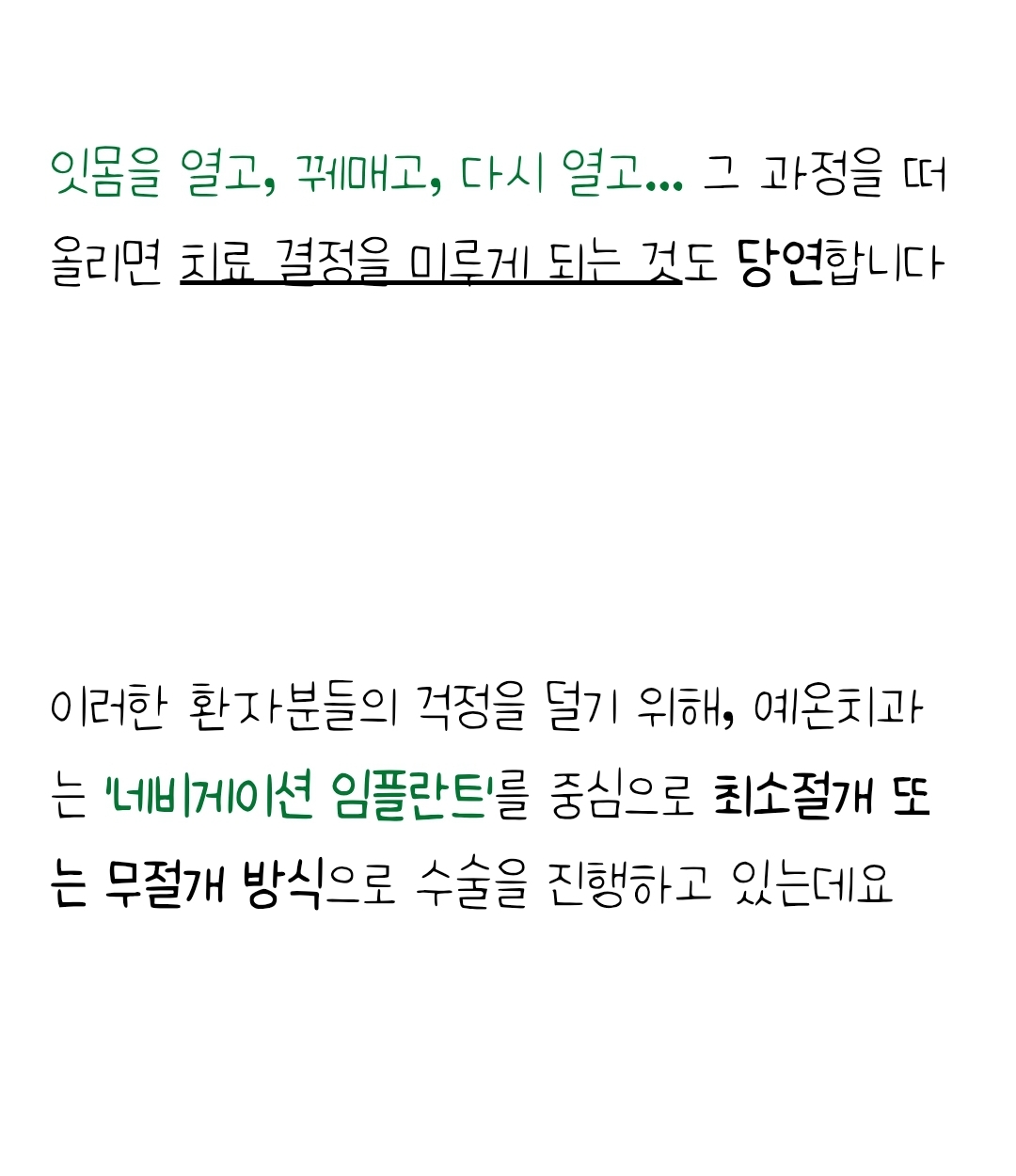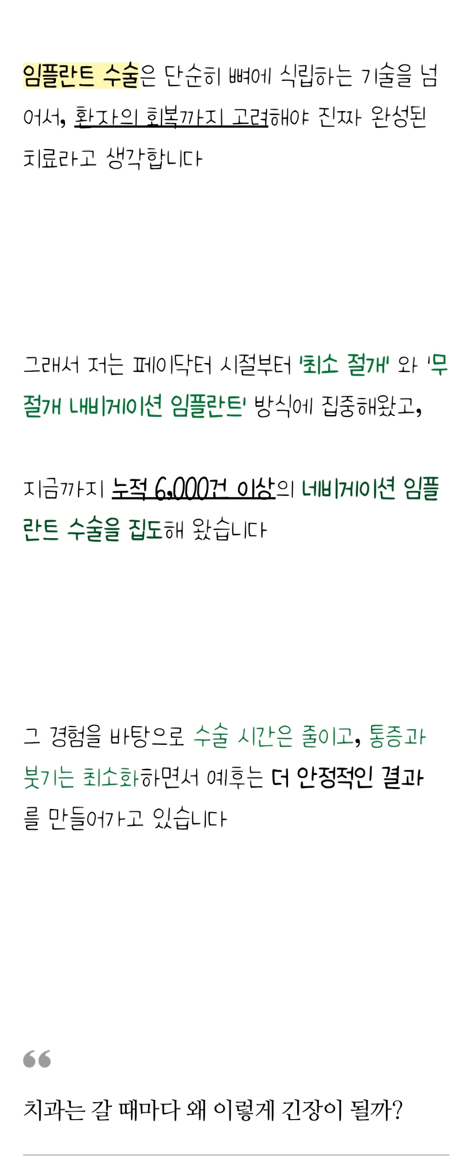“임플란트는 의료진의 경험과 기술이 결과를 좌우합니다. 특히 잇몸 상태가 좋지 않은 경우 더욱 전문적인 접근이 필요합니다.” – 구월동 소재 A치과 원장